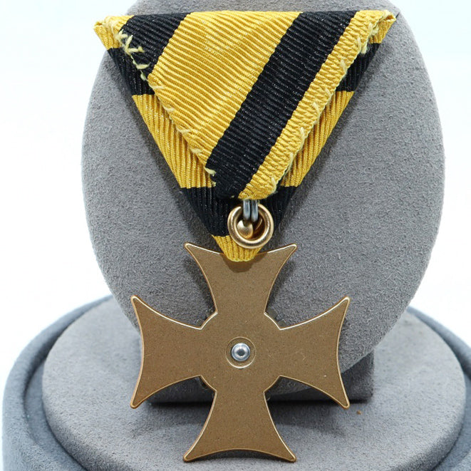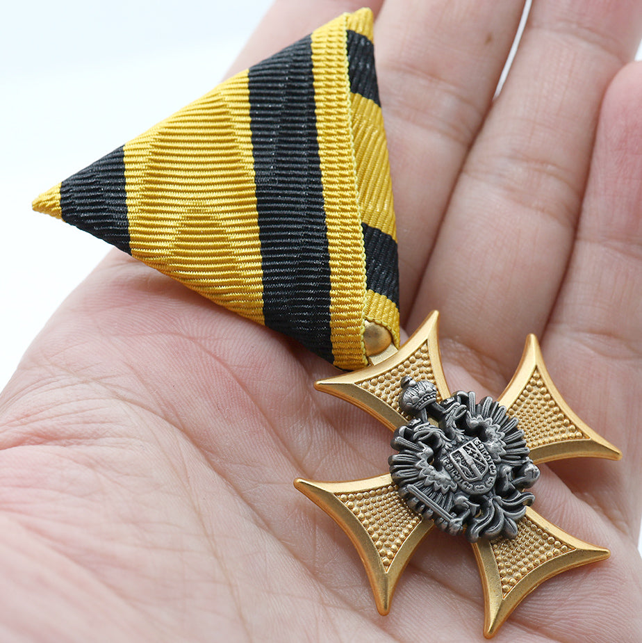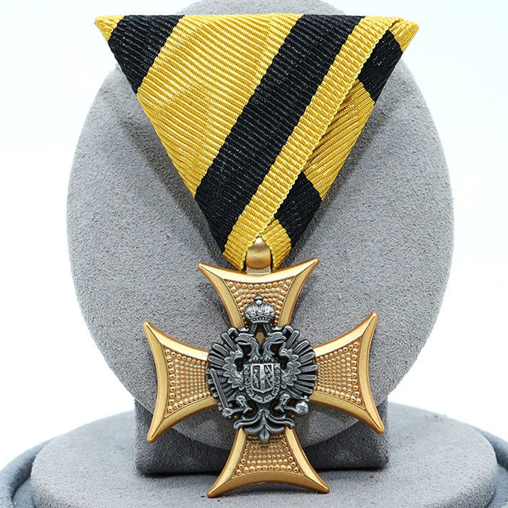 Detailed reproduction of the Austro-Hungarian Officer’s Military Service Decoration, 3rd Class. The gilded Maltese-style cross features the crowned double-headed Habsburg eagle on the obverse and is suspended from the traditional black-and-yellow Austrian triangular ribbon. A striking display piece for collectors, reenactors, or historical study. New condition; non-original maker. Collector replica / reproduction.