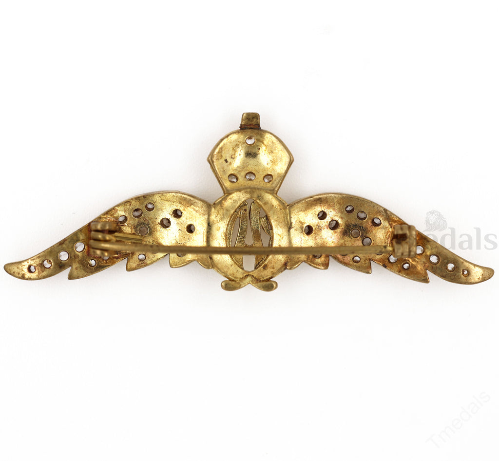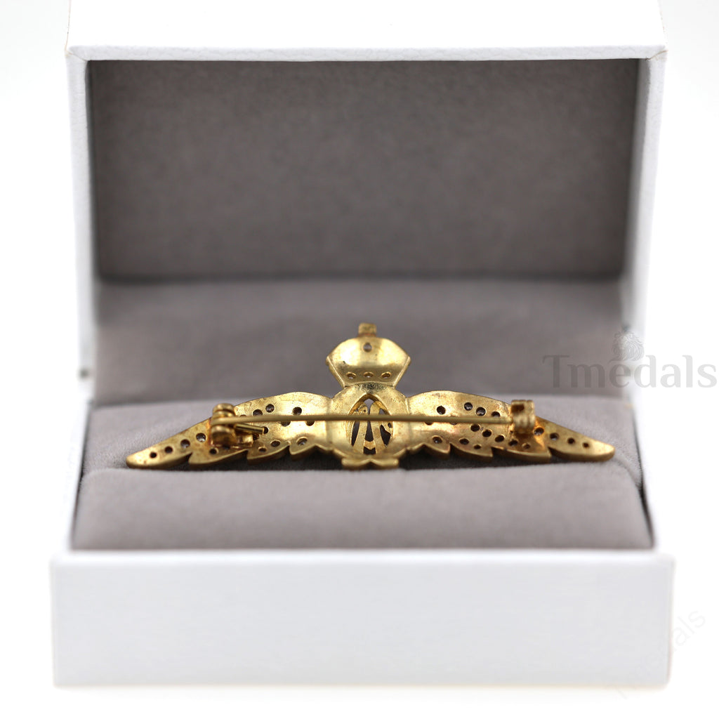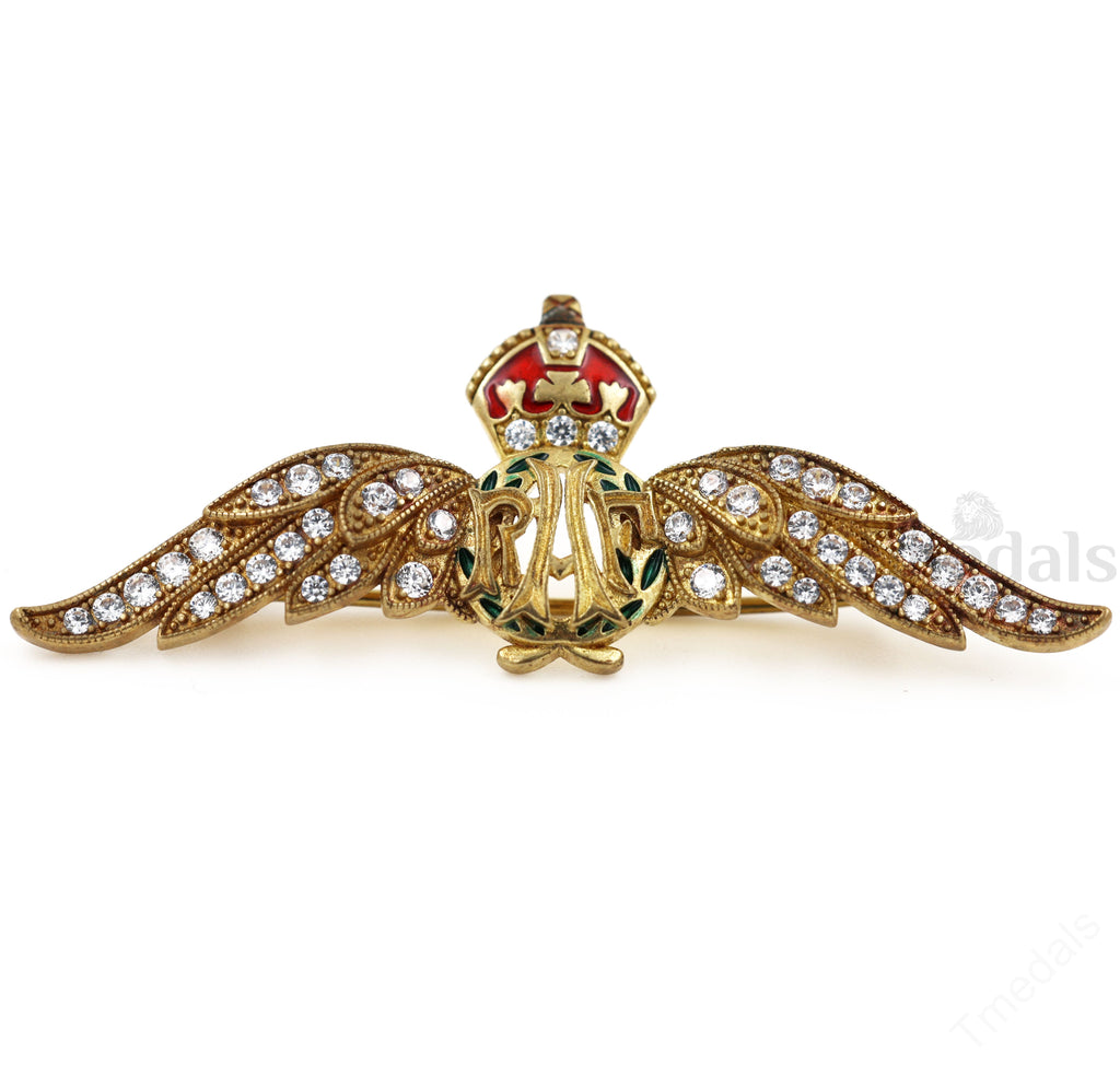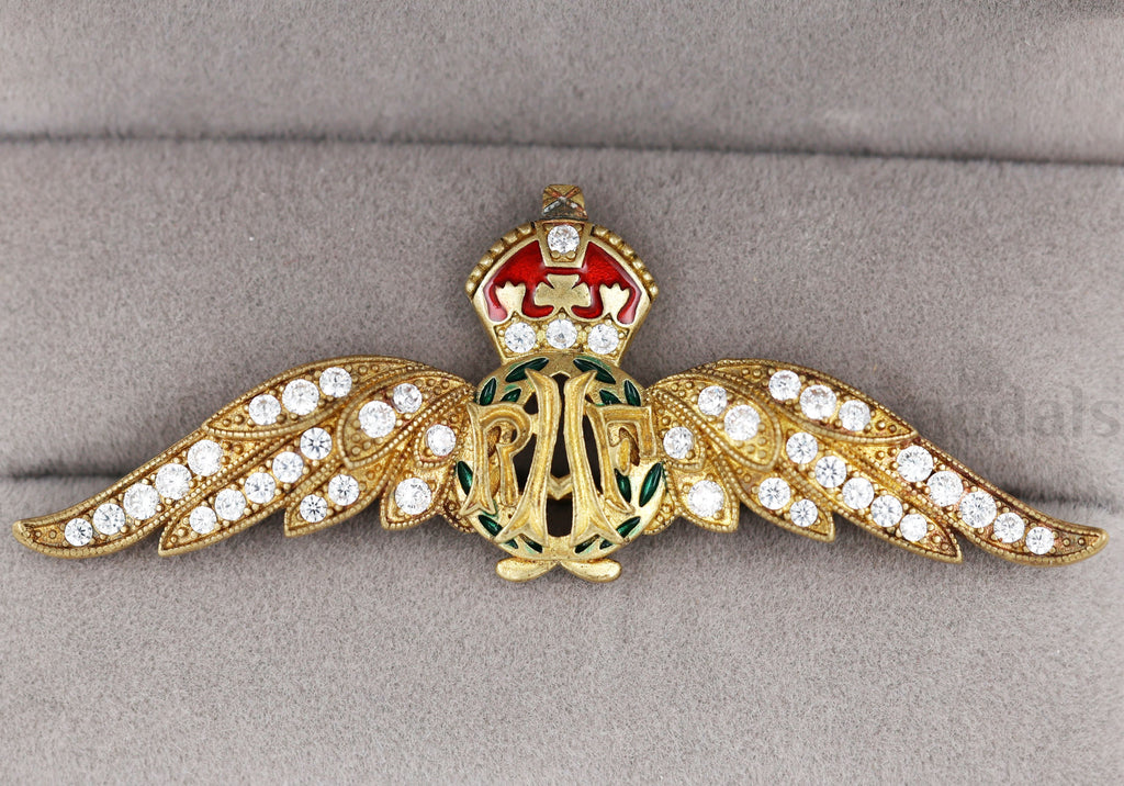 Cased Uk RAF Pilot Wings Brooch–Gold-Tone, Rhinestones & Enamel Crown (Replica)