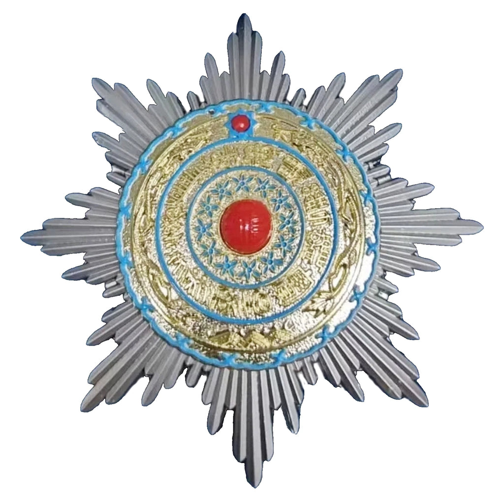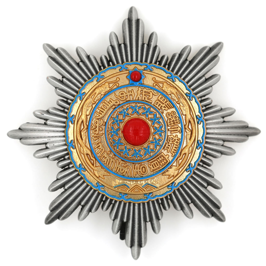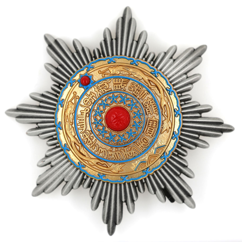 Museum-style replica of the Qing Order of the Double Dragon breast star, 2nd Class, 1st Grade. Crisp multi-ray star with blue ringwork and a red center. Reverse with long vertical pin & catch (see photos). Full-size display piece for study and collecting.