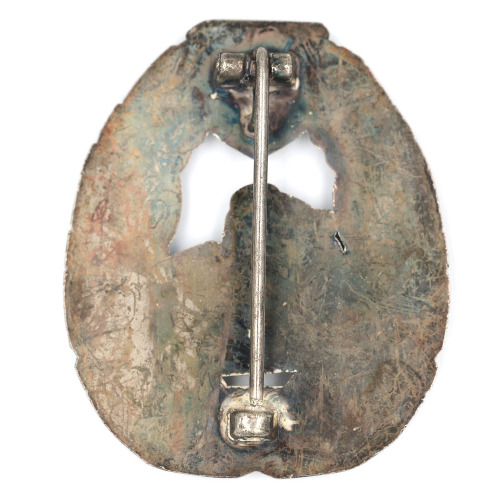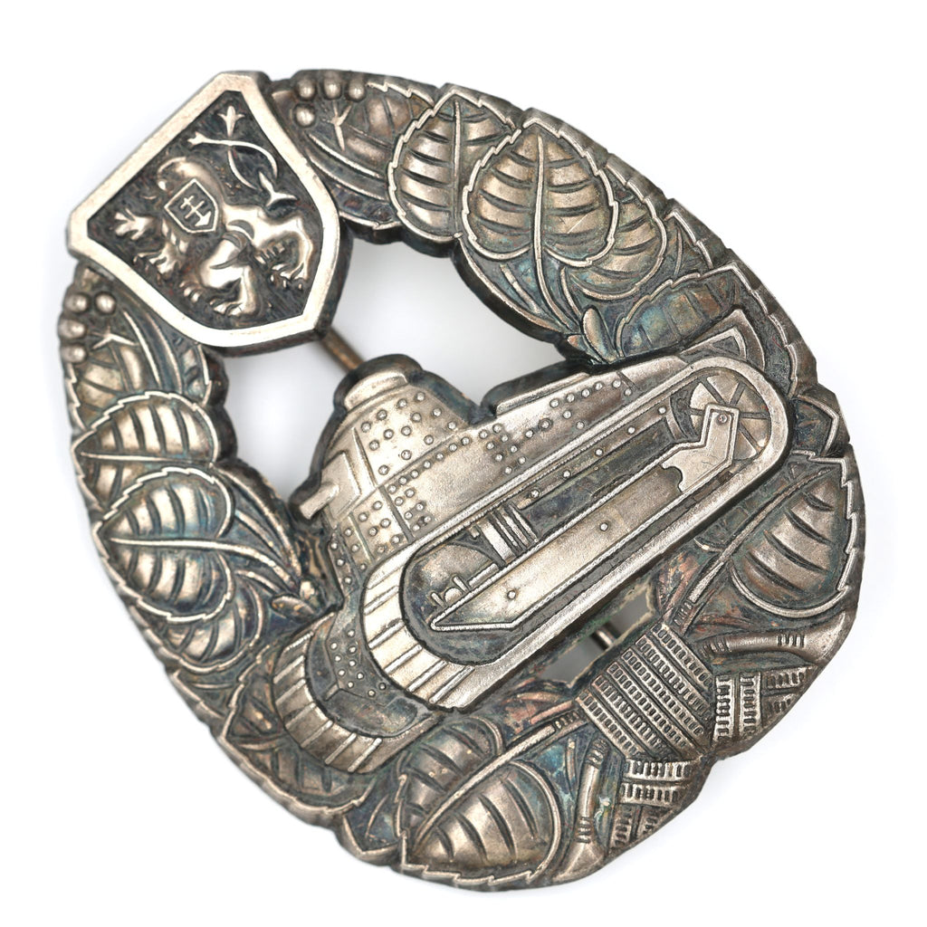 Silver-coloured metal badge in the form of an oval wreath of stylised linden leaves, surmounted by the national shield with lion and double cross. In the centre is a detailed Renault FT tank in profile. Hollow back with long horizontal pin and catch, as shown.