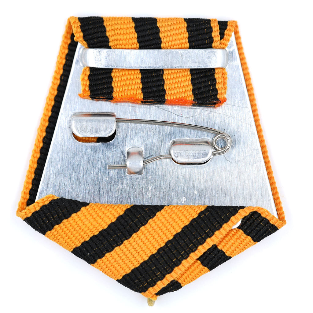 Replica Imperial Russian St George medal ribbon bow with the classic black and orange stripes. This ready-made suspension is ideal as a replacement mount for a St George cross/medal or for use on display boards and reenactment uniforms.
