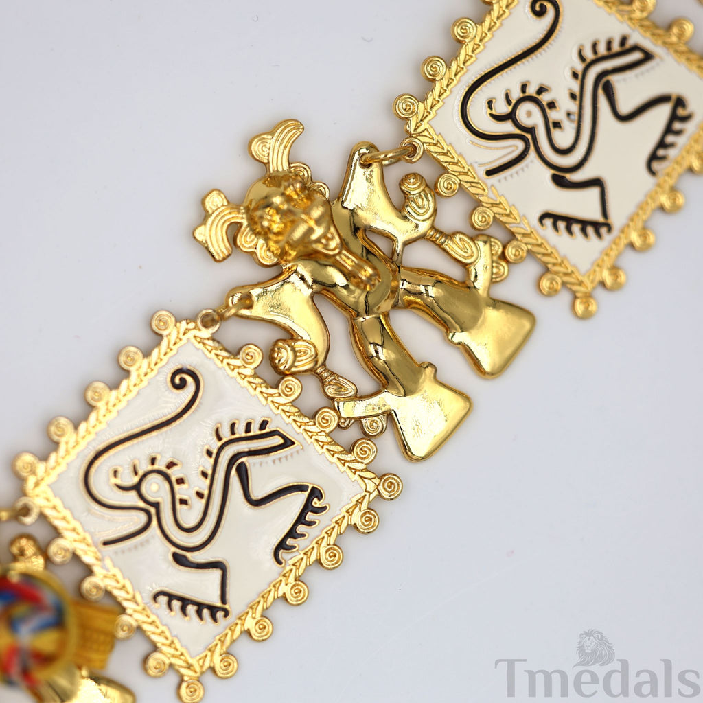 Collar chain with alternating white-enamel panels and gold-tone figures in pre-Columbian style