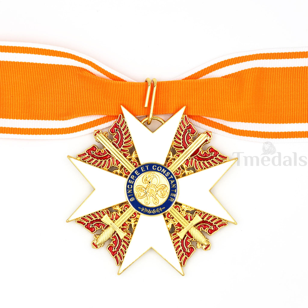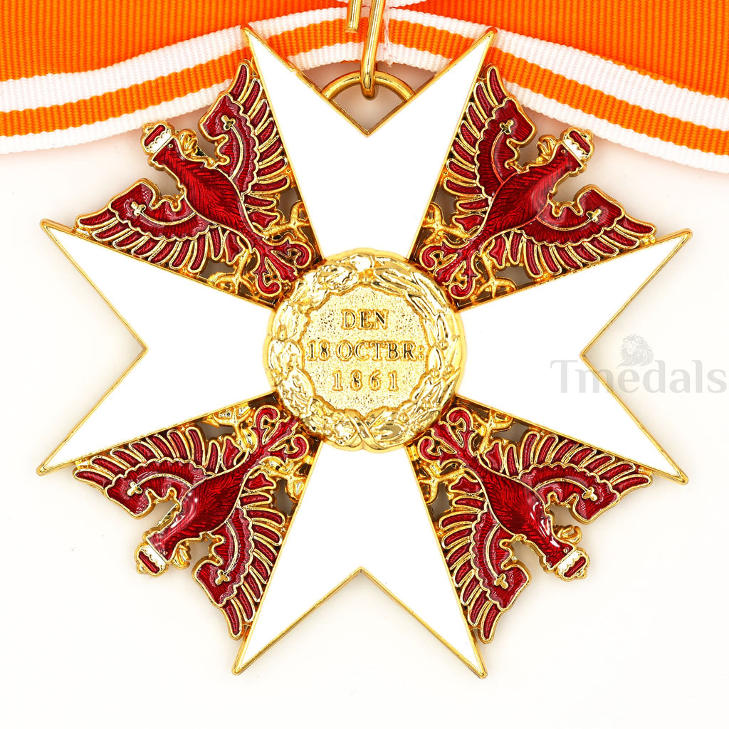 Replica of the Order of the Red Eagle (Prussia) neck badge with crossed swords for wartime merit. Features a white-enamel eight-pointed cross with red eagles between the arms, blue center ring with “SINCERE ET CONSTANTER” motto, and gilt details. Comes with the traditional orange-white neck ribbon.