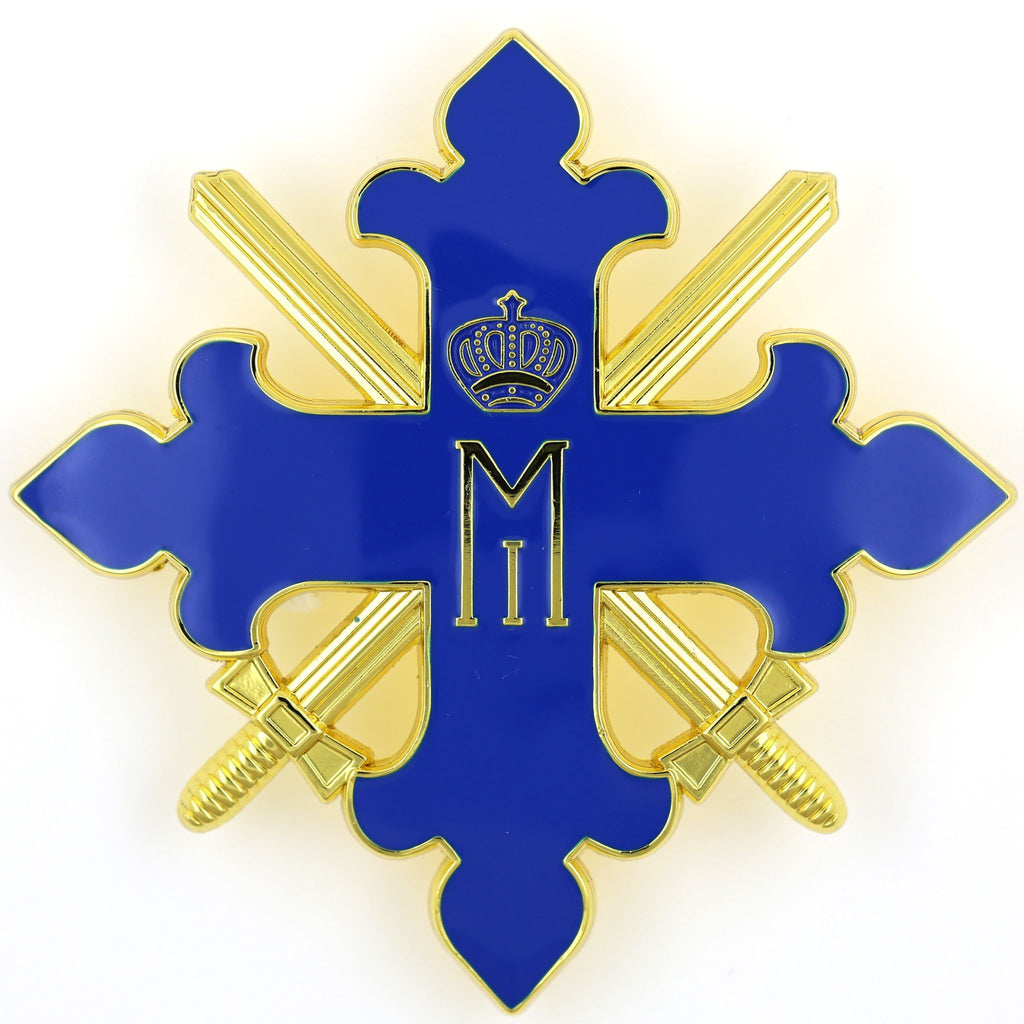 • Design: Blue cross pattée, crowned “M” cipher, crossed swords; gold-tone rim and details