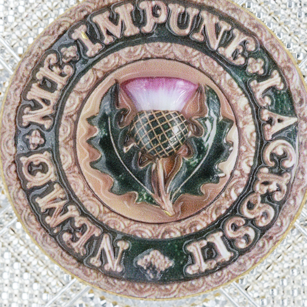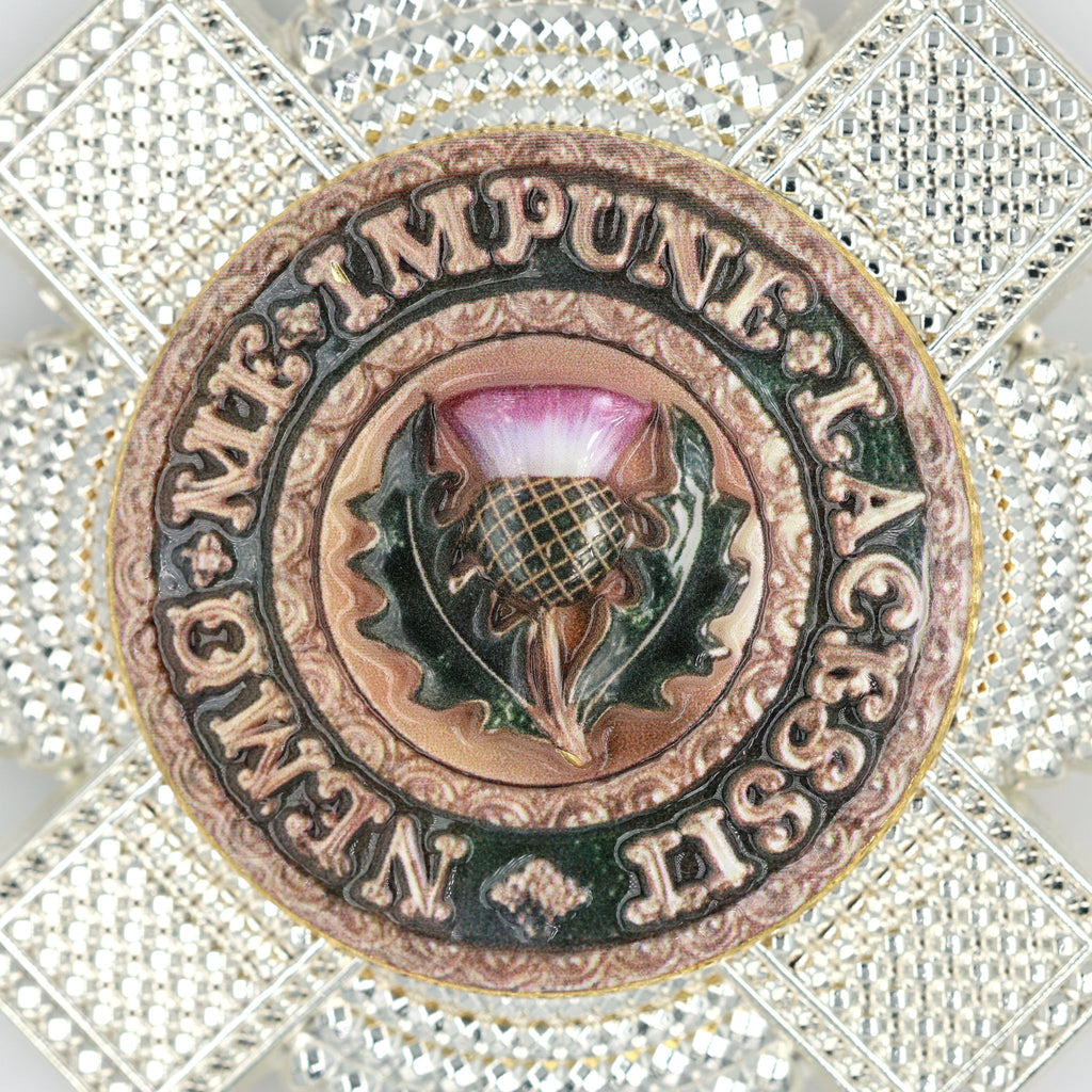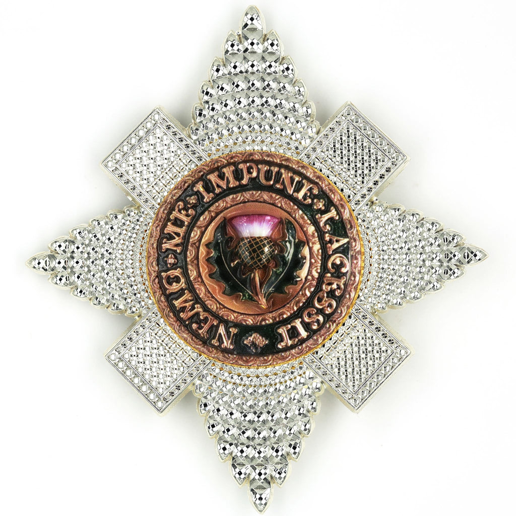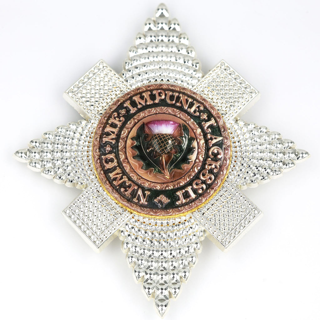 Faithful reproduction of the Order of the Thistle breast star, the highest Scottish order of chivalry. The design shows the thistle within the motto “Nemo me impune lacessit” (“No one provokes me with impunity”), finished in bright silver with a coloured thistle boss and raised lettering.