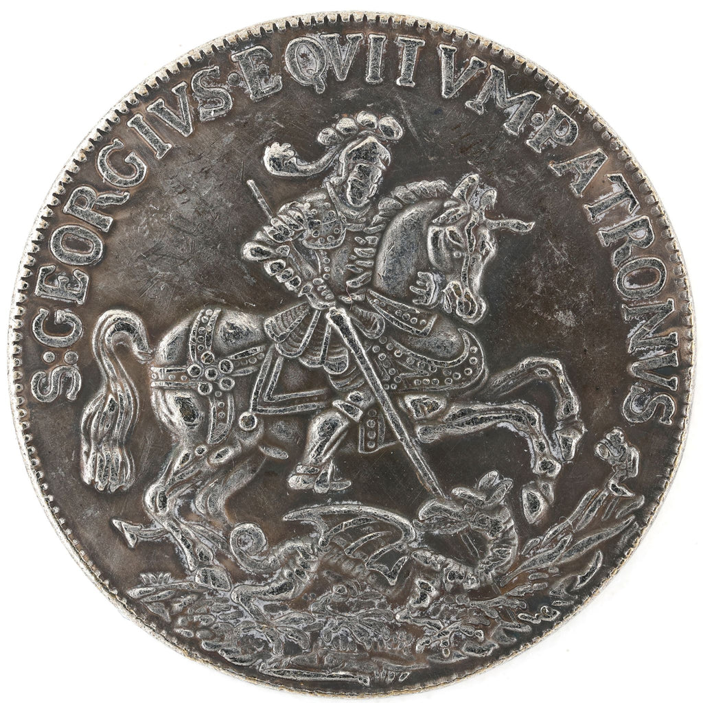 ⚜️ Obverse: St. George slaying the dragon, with legend S. GEORGIVS EQVITVM PATRONVS (St George, Patron of the Knights), symbolizing victory of faith over evil.