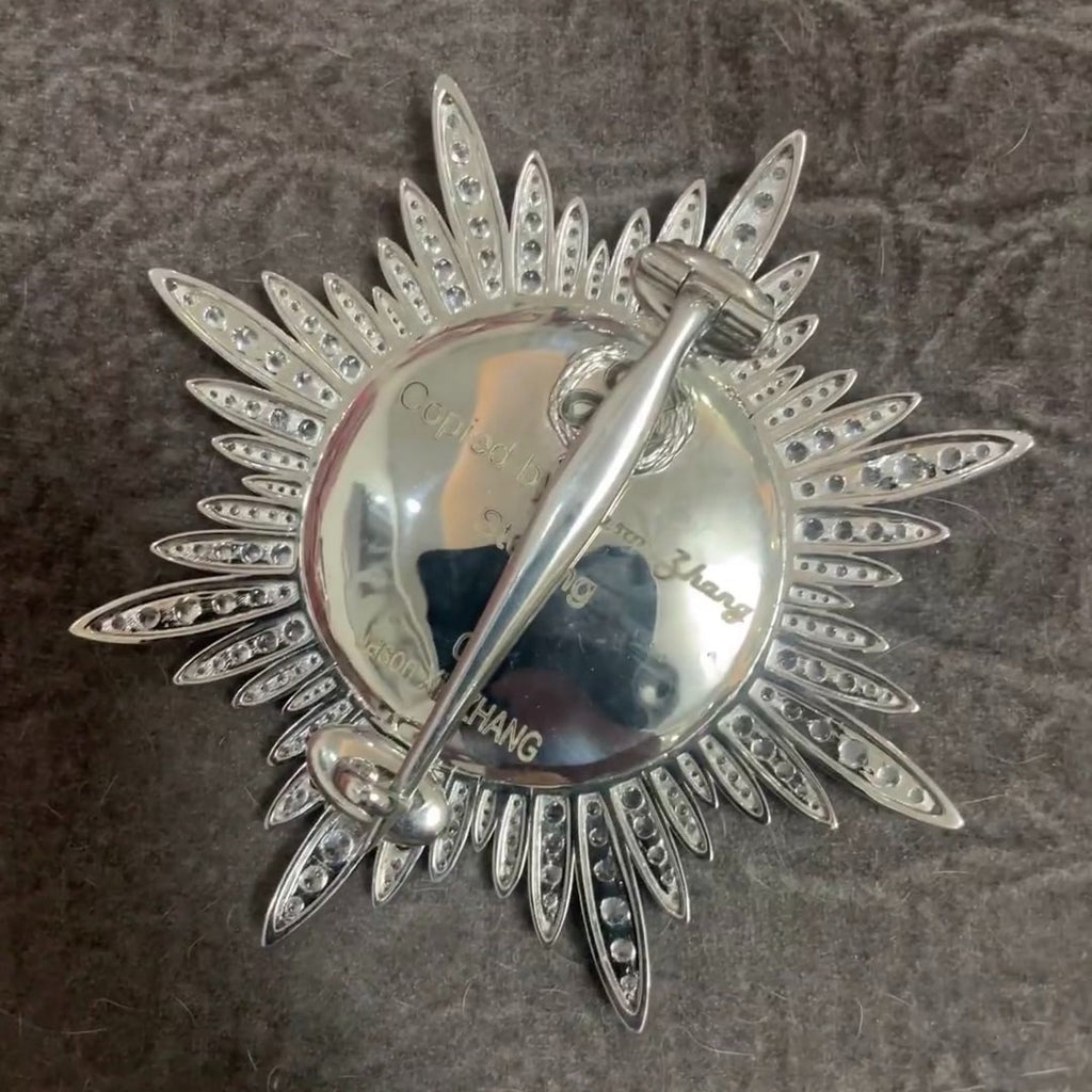 Premium full-size replica breast star of the Order of the Garter in 925 sterling silver. Radiant eight-point rays with clear stones, a red jeweled cross, and the blue enamel garter with HONI SOIT QUI MAL Y PENSE. Sturdy horizontal pin on the reverse for secure wear or display. A high-quality sterling reproduction for collectors, theatre, cosplay, and historical exhibits. Replica only—no honors implied. Care: polish with a silver cloth and store in an anti-tarnish pouch.