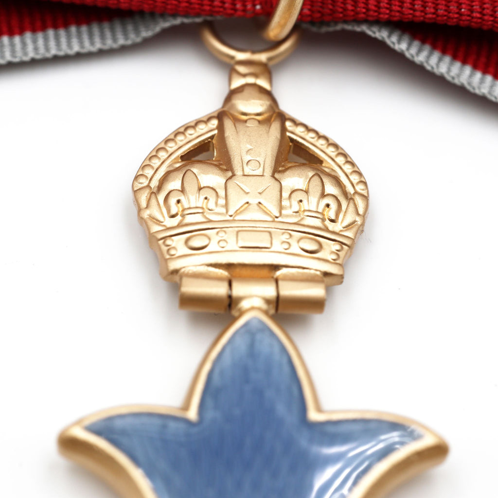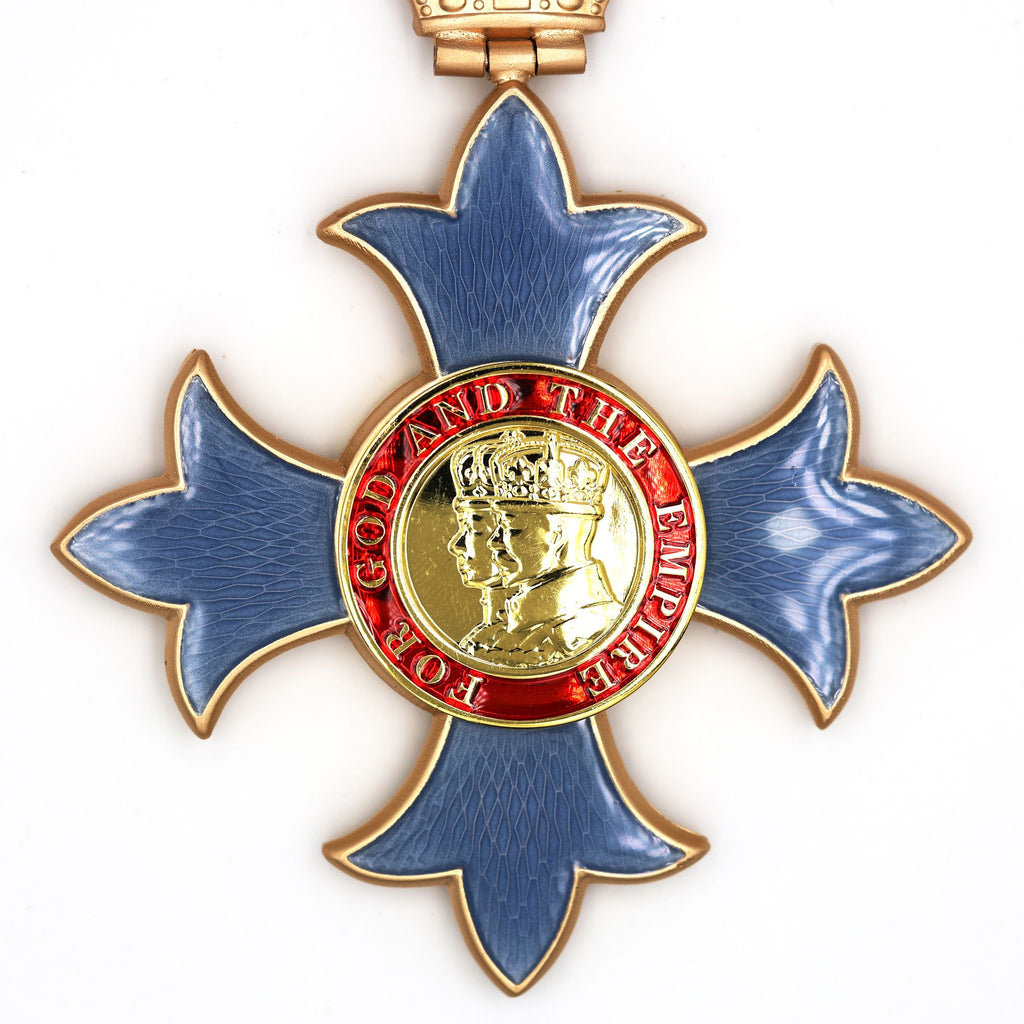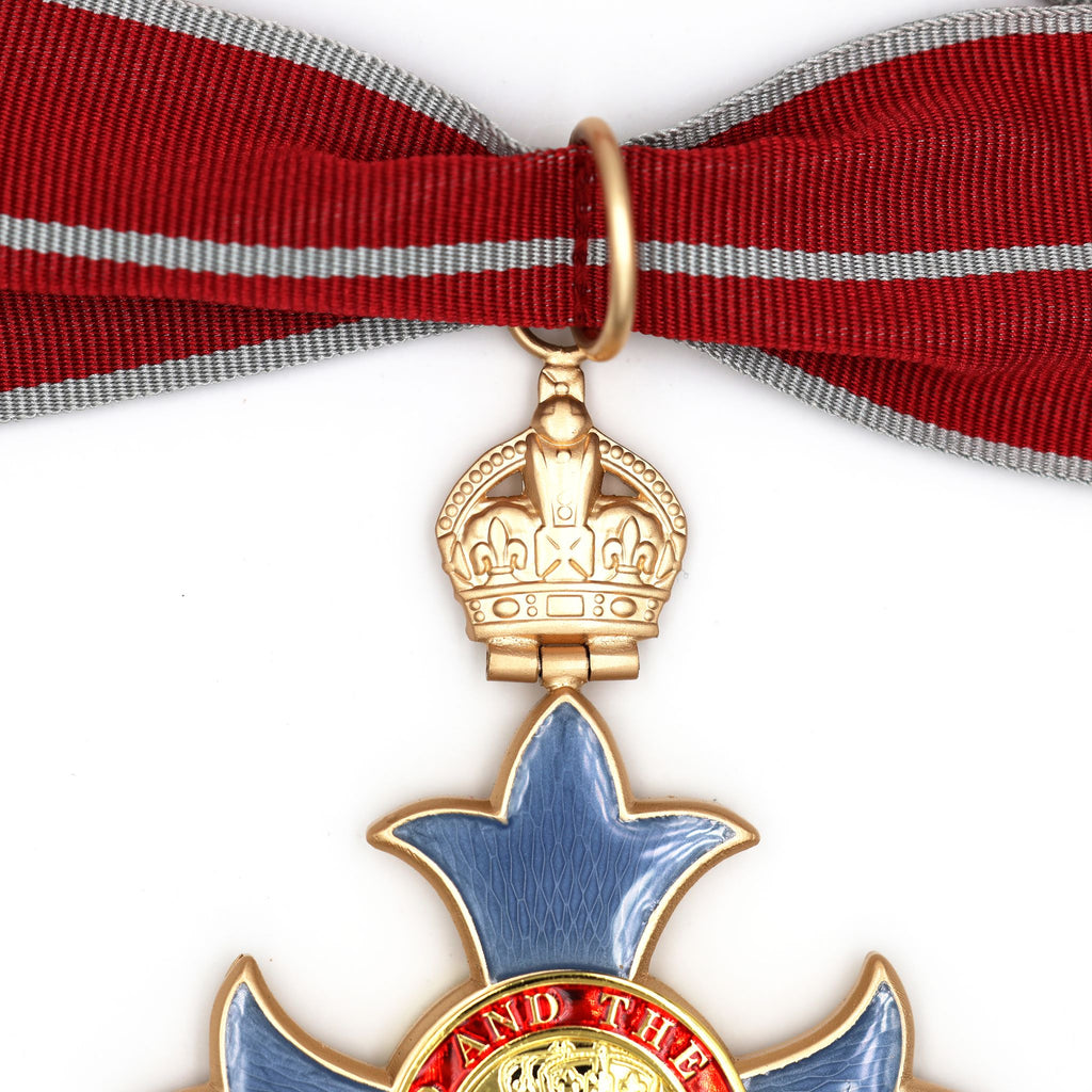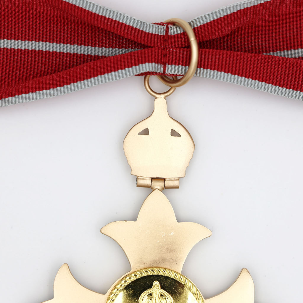 Faithfulreplicaof theCommander of the Order of the British Empire (CBE), Military Division,post-1936 pattern. Cast inbrasswith a bright gilt finish, the Tudor cross shows light-blue textured enamel arms and a central crowned effigy within a red circlet readingFOR GOD AND THE EMPIRE. Supplied on the correctcrimson neck ribbon with silver-grey edges and a central grey stripe(Military Division), with crown suspension. A sharp, display-ready piece for collectors, theatre, cosplay, and education.Replica only—no honors implied.