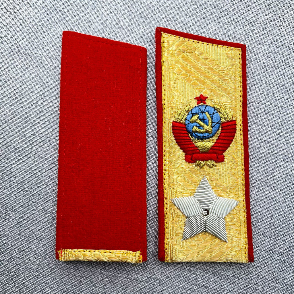 In 1943 the USSR reintroduced epaulettes; marshals received gold boards with red edging, USSR emblem and a single large silver star to mark their unique status. This style remained in use in the late Soviet period.