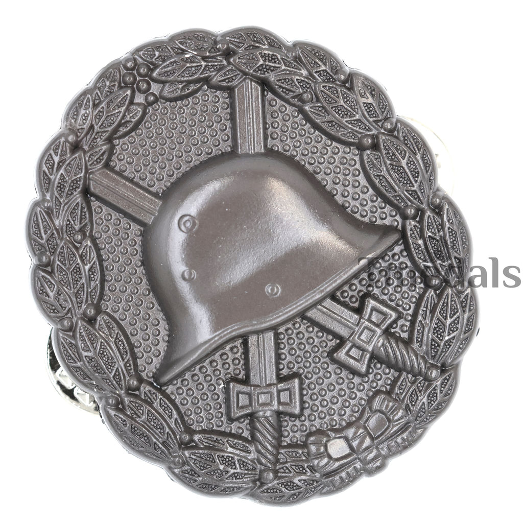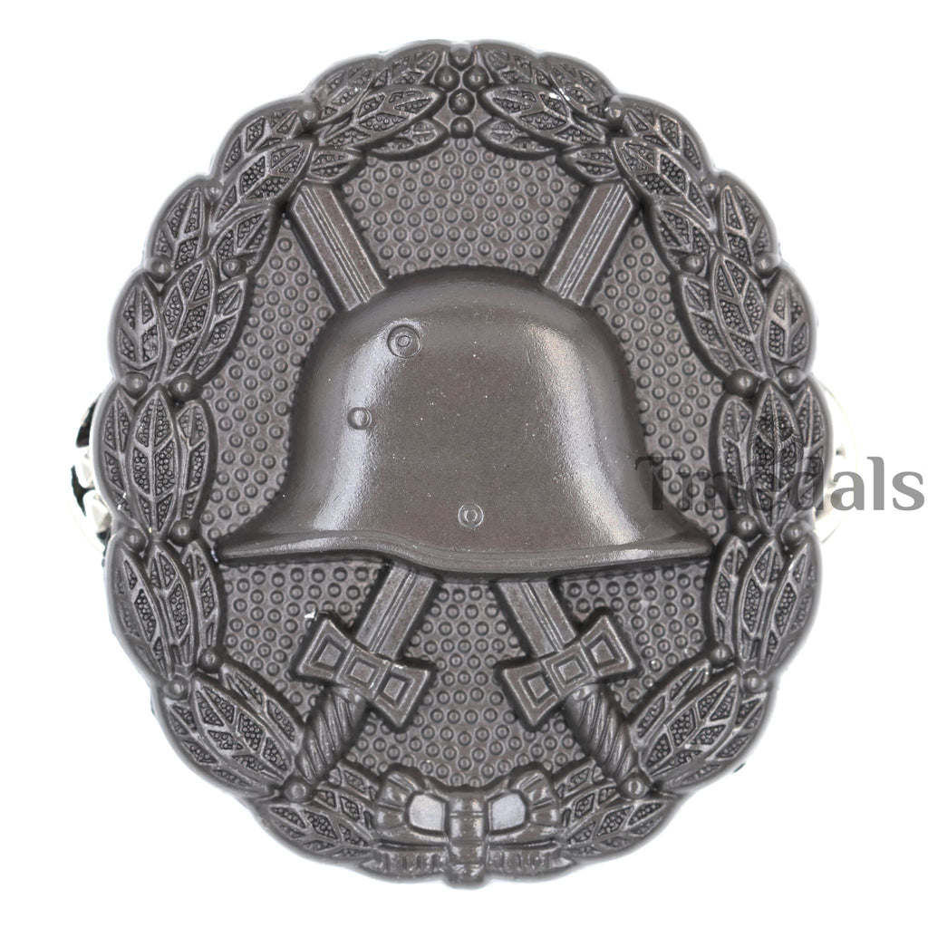 A high-quality reproduction of the WWI-era German Wound Badge (Verwundetenabzeichen), featuring the classic helmet-and-swords design with a detailed laurel wreath. Ideal for collection display, reenactment, or uniform presentation.